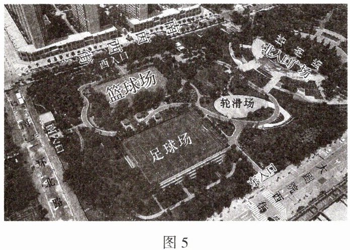 21. 某城市体育公园是市民平日里锻炼健身的好去处。公园位于南北向的大剧院西街和南茵西街之间,由多个园区组成。图5是其中一个园区。请参与制作这个园区的地图,完成下列要求。