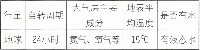 |地球|24小时|氮气、氧气等|15℃|有液态水|