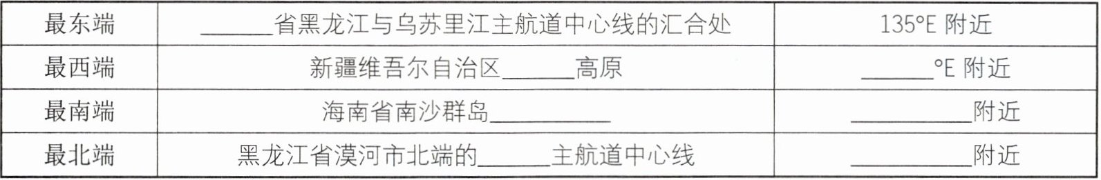 |最东端|____省黑龙江与乌苏里江主航道中心线的汇合处|135°E 附近|