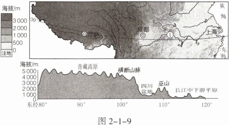 纪录片《北纬30°·中国行》着重展现了我国北纬30°沿线地区的自然风光、历史文化等。图2-1-9为我国北纬30°附近地区地形及地形剖面示意。据此完成13~14题。