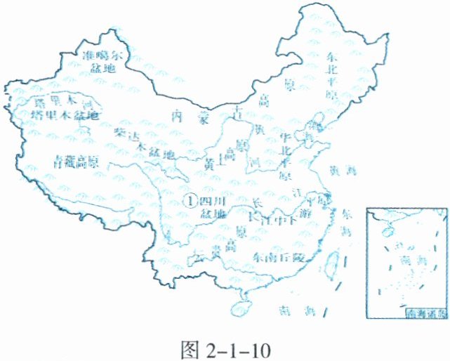 地理课上学习完“中国地形”这部分内容后,李华所在的小组开展了关于中国地形的竞赛活动。图2-1-10为中国地形分布示意。据此完成15~17题。