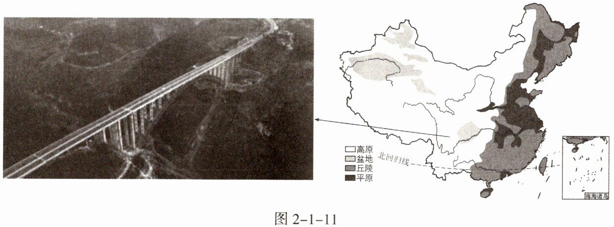 横断山脉因其走向横断东西交通而得名,是中国地理、生态和文化的重要分界线,是中国乃至全球生物多样性最丰富的地区之一,被誉为“物种基因库”。图2-1-11示意我国地形及兴康特大桥景观。