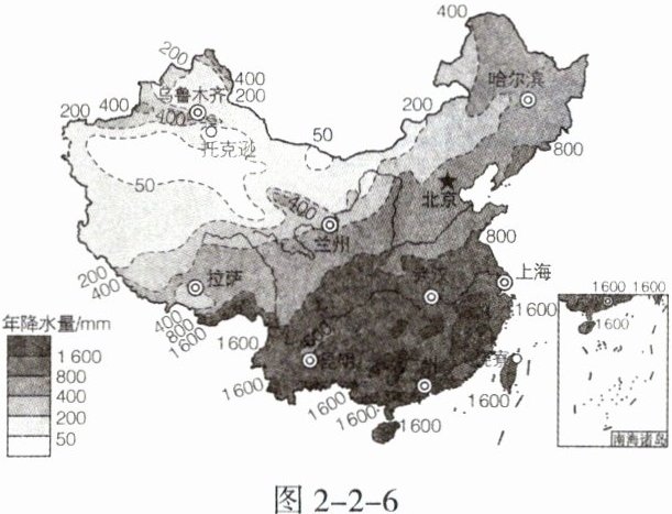 某校地理兴趣小组计划开展关于“中国降水”的主题学习活动,图2-2-6示意中国年降水量分布。据此完成4~5题。