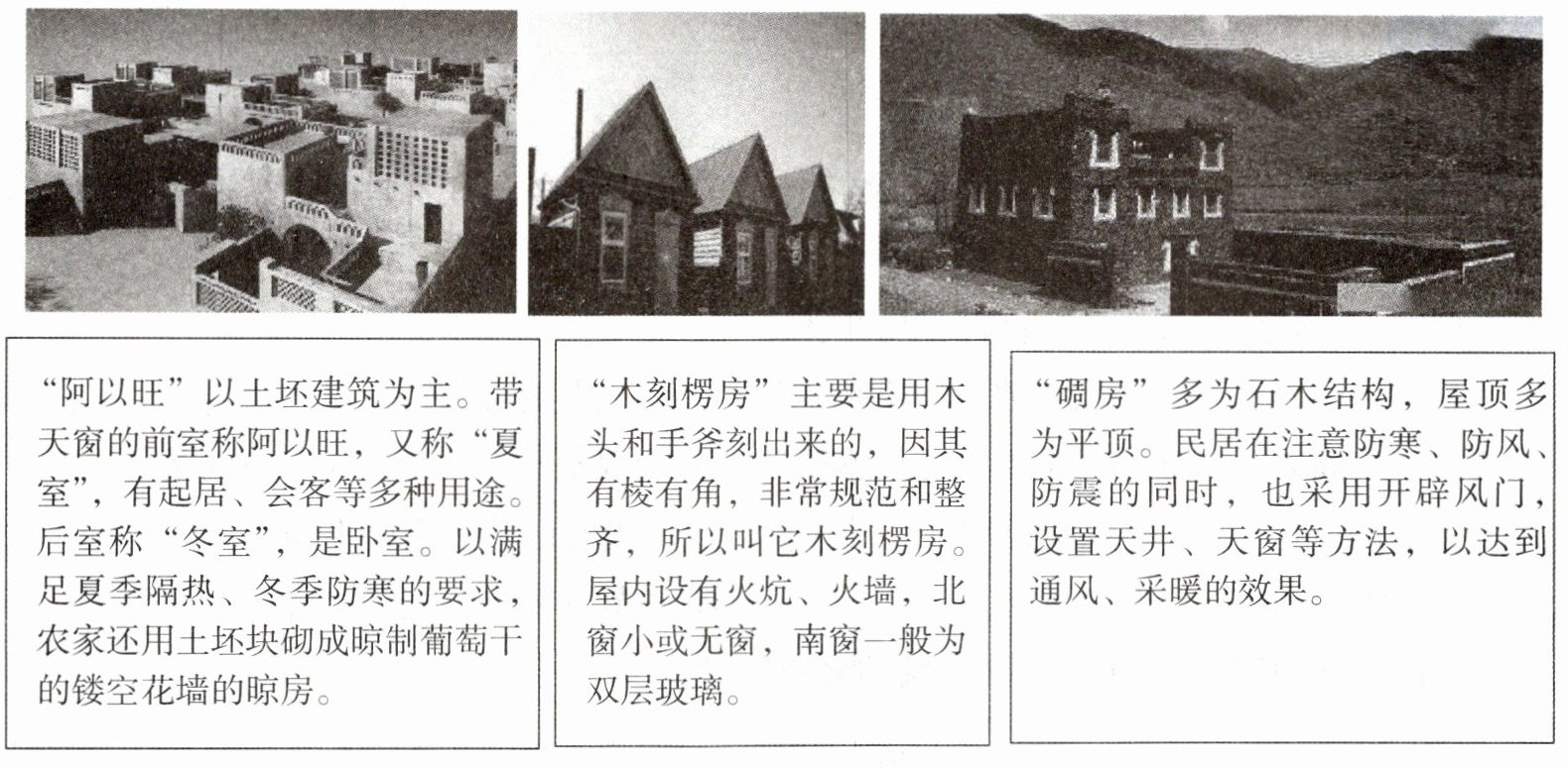 (1)南北温差大 (2)B (3)夏季高温多雨 亚热带季风 (4)上海:亚热带 水稻 ③地:东北平原 小麦 一年一熟 (5)b c a (6)较小 ④ 海拔高,气温低 (7)⑤ ③ ④ (8)“阿以旺”所处地区以温带大陆性气候为主,冬冷夏热,气候较为干旱。天窗在夏季可以通风,后室作为冬室,可以防寒。晾房可以晒制葡萄干。“木刻楞房”所处地区以温带季风气候为主,冬季寒冷漫长,火炕、火墙,北窗小或无窗,南窗一般为双层玻璃,是为了冬季保暖。屋顶坡度大,便于积雪融化后排水。“碉房”所处地区为高原山地气候,全年气温较低,平顶说明降水较少,风门、天井、天窗可以通风、采暖。