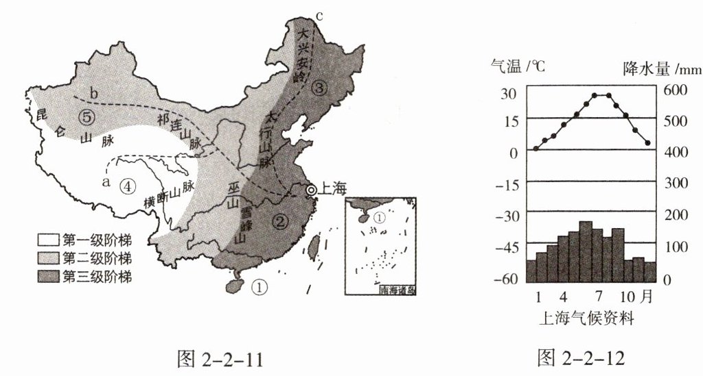 (5) 图2-2-11三条路线(a、b、c)中,研学期间到达的目的地炎热干燥的是______,经过地区地形最为平坦的是______,能够欣赏雪山连绵风景的是______。