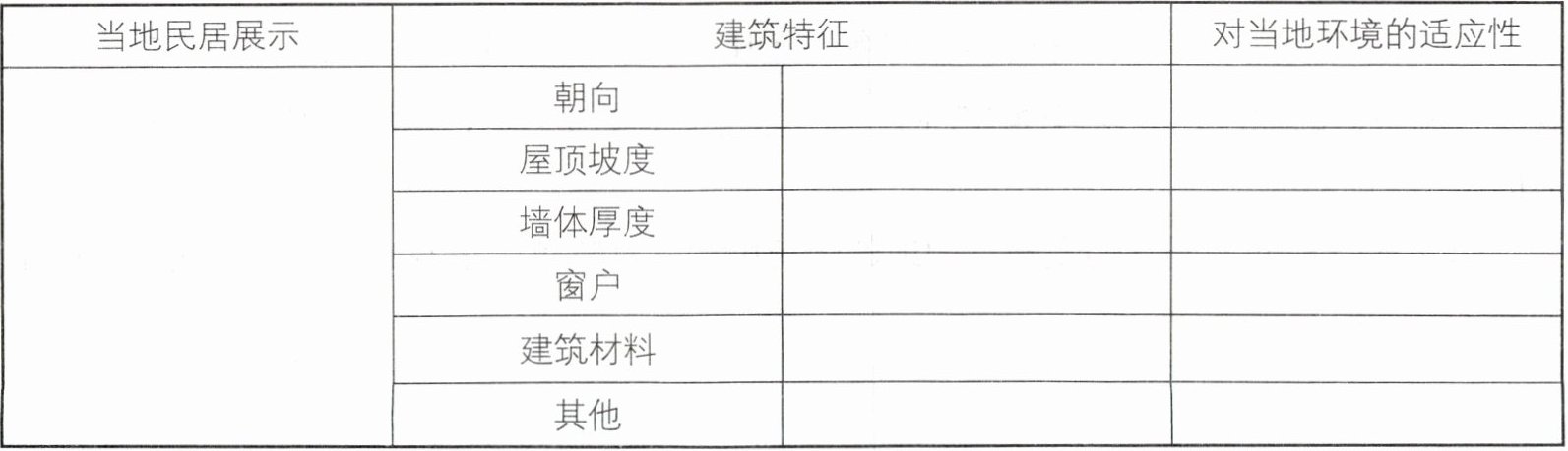 (2) 记录建筑特征并分析其与自然环境的关系,补充下列表格。