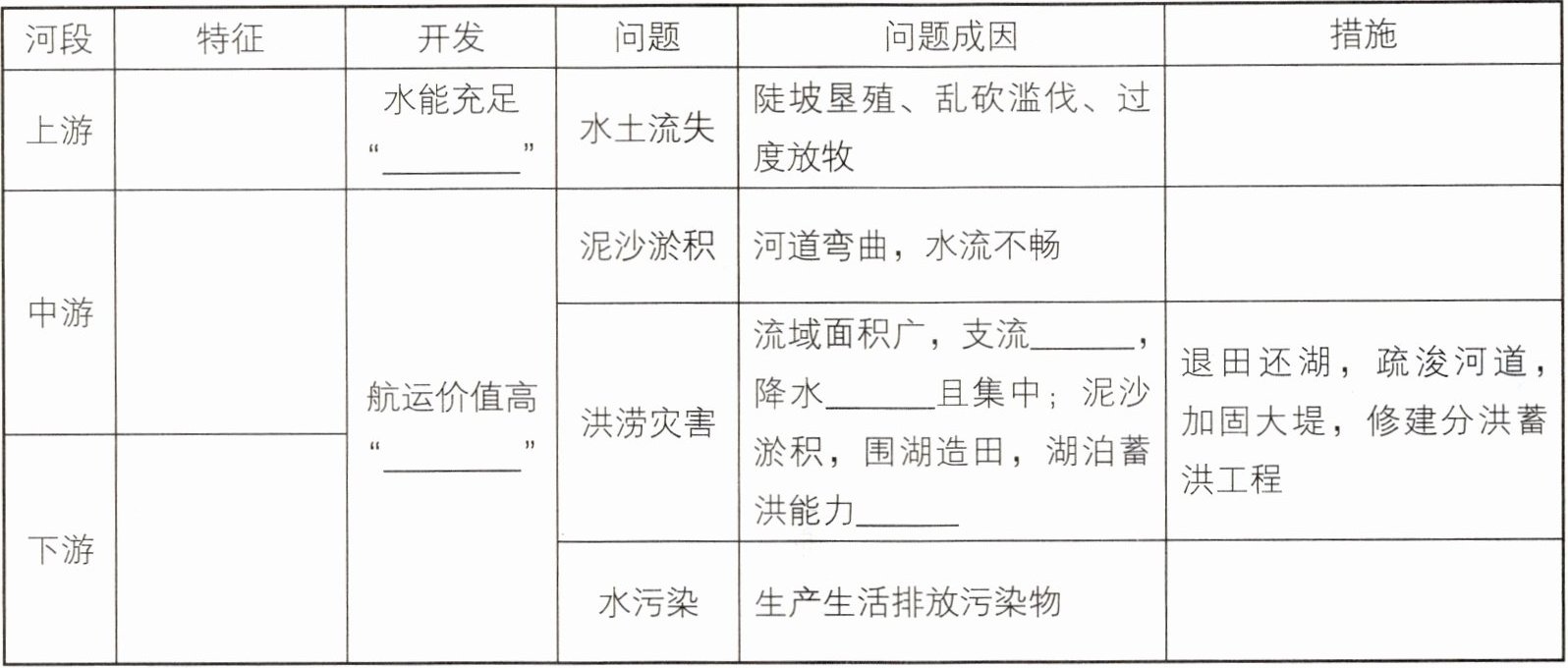 | | | |洪涝灾害|流域面积广,支流______,降水______且集中;泥沙淤积,围湖造田,湖泊蓄洪能力______|退田还湖,疏浚河道,加固大堤,修建分洪蓄洪工程|