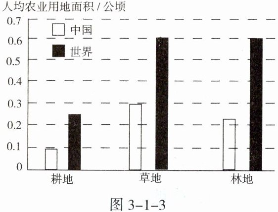 我国地大物博,陆地面积居世界第三位,但人均土地面积仅相当于世界人均土地面积的 $2/5$,人多地少是基本国情。图 3 - 1 - 3 示意我国人均农业用地面积与世界人均数的比较情况。据此完成 1~2 题。