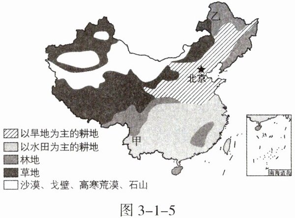 森林火灾是一种突发性强、破坏性大、处置救助较为困难的自然灾害。图 3 - 1 - 5 示意我国主要土地利用类型分布。据此完成 6~7 题。