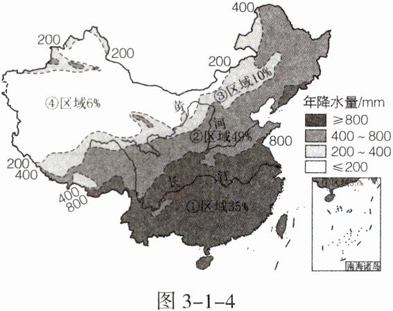 “民非谷不食,谷非地不生。”我国很多古诗文描述了耕地与农业生产的紧密联系。图 3 - 1 - 4 示意我国耕地在不同降水量地区的占比情况。据此完成 3~5 题。