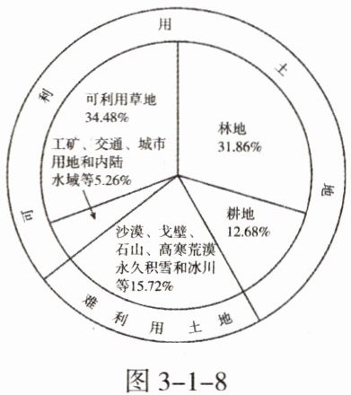 沙漠地区的土地通常存在缺水、土壤贫瘠等问题,难以直接用于常规的农业或其他大规模开发利用,而科研人员将其用于建设沙漠温室,对这类土地资源进行创新性开发利用。新疆塔里木盆地万亩沙漠温室内,科研人员在水稻试验区采用垂直立体无土栽培方式试种快速繁育水稻获得成功。图 3 - 1 - 7 示意我国土地资源分布情况,图 3 - 1 - 8 示意我国土地利用类型的构成。