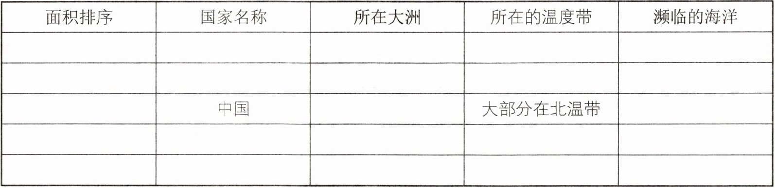 (1)查阅相关资料,说说世界上陆地面积居前五位的国家分别有哪些,将它们按面积大小排序并依次填入下表。