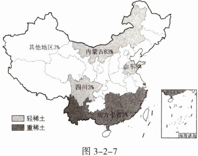 稀土是元素周期表中的镧系元素和钪、钇共 17 种金属元素的总称,俗称“工业黄金”,广泛用于军事、航天等高技术领域,可制造芯片、永磁体等。中国稀土储量约 4400 万吨,占全球的 40%,位居世界第一,尤其是重稀土,目前全球已知可采储量几乎是中国独有。图 3 - 2 - 7 示意我国稀土资源分布情况。据此完成 6 ~ 8 题。