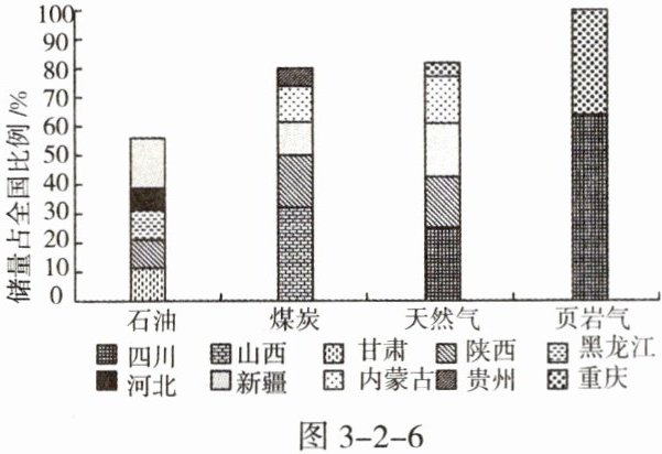 页岩气是蕴藏于页岩层中可供开采的天然气资源,具有清洁、高效的特点,在全球能源领域中愈发重要。近年来,我国大力开发页岩气并取得显著成效。图 3 - 2 - 6 示意我国已探明的主要能源矿产储量地区分布。据此完成 3 ~ 5 题。