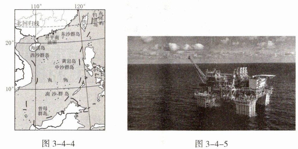 我国持续深耕海洋资源勘探开发,2024年在珠江口盆地发现首个深水深层油田——开平南油田(储量1.02亿吨)。2025年建成“万亿方大气区”,为粤港澳大湾区和海南岛供应清洁能源。图3-4-4示意我国部分海洋区域,图3-4-5是海上油气资源勘探实景图。据此完成3~4题。