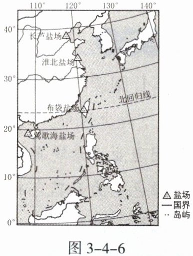 2023年7月,长芦盐场的盐光互补项目并网发电。盐光互补是在保证盐业生产前提下,实现水上太阳能发电、水面蒸发制盐、水下水产养殖,从而提高单位面积产值的产业发展模式。图3-4-6示意中国主要盐场分布。据此完成5~7题。