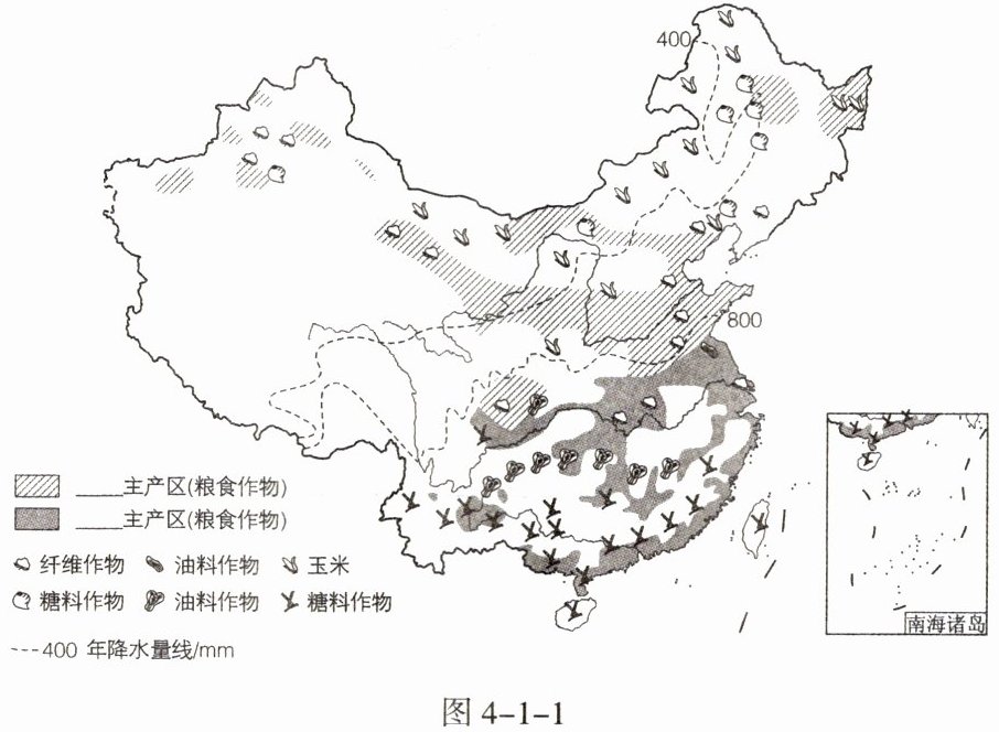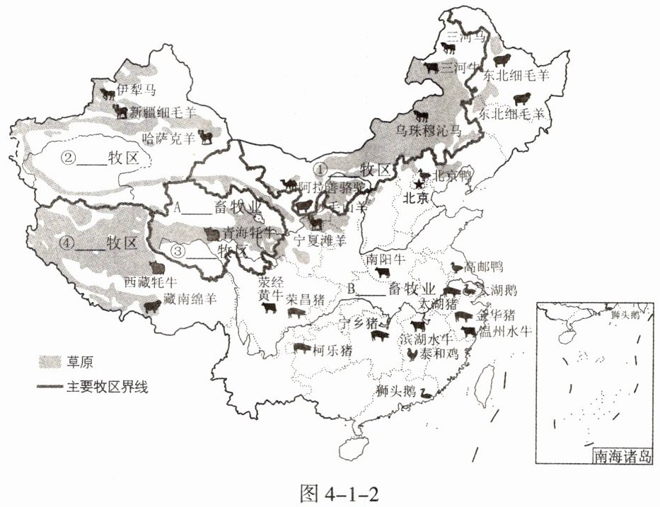 2. 在图 4-1-2 上相应位置填写牧区畜牧业和农耕区畜牧业;填写数字序号所代表的四大牧区的名称及其优良畜种。