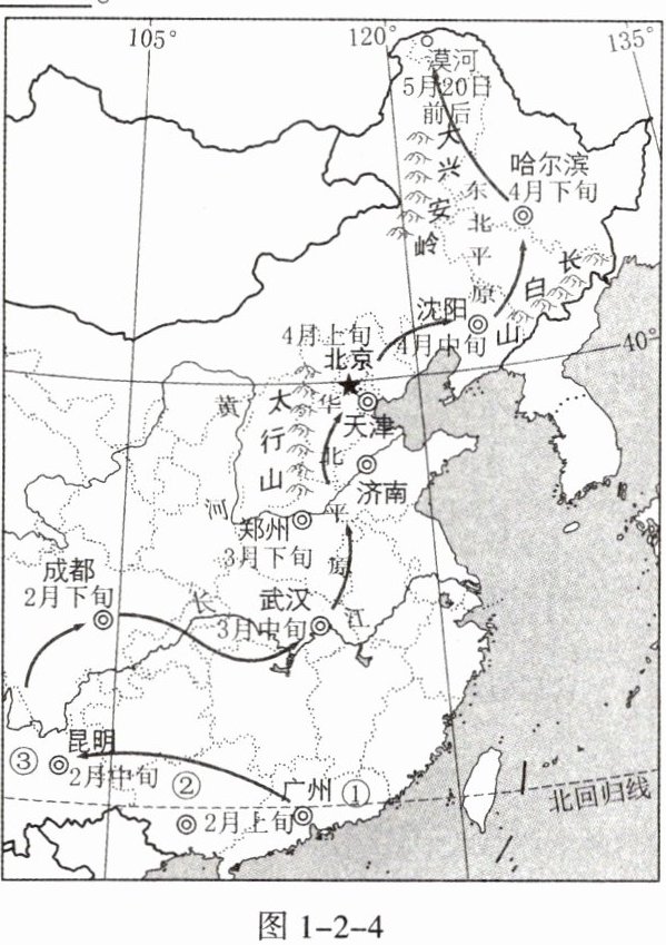 我国大部分地区位于北温带,四季分明。立春伊始,万物渐渐复苏,从南向北春回大地。图 1-2-4 是春姑娘的旅程图。