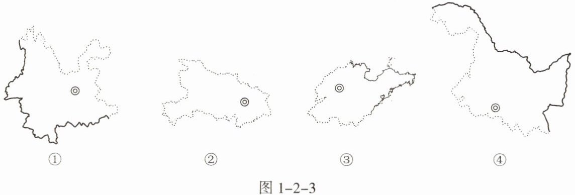 春联承载着中国各地的传统文化,通过春联的内容,可以直观地感受到不同省区的地理、文化和历史。图 1-2-3 示意我国部分省区轮廓。据此完成 6~7 题。