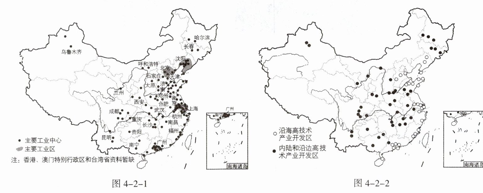 (需在图上填写:辽中南工业区、京津唐工业区、沪宁杭工业区、珠江三角洲工业区;圈出指定工业中心)