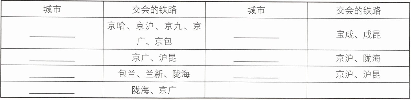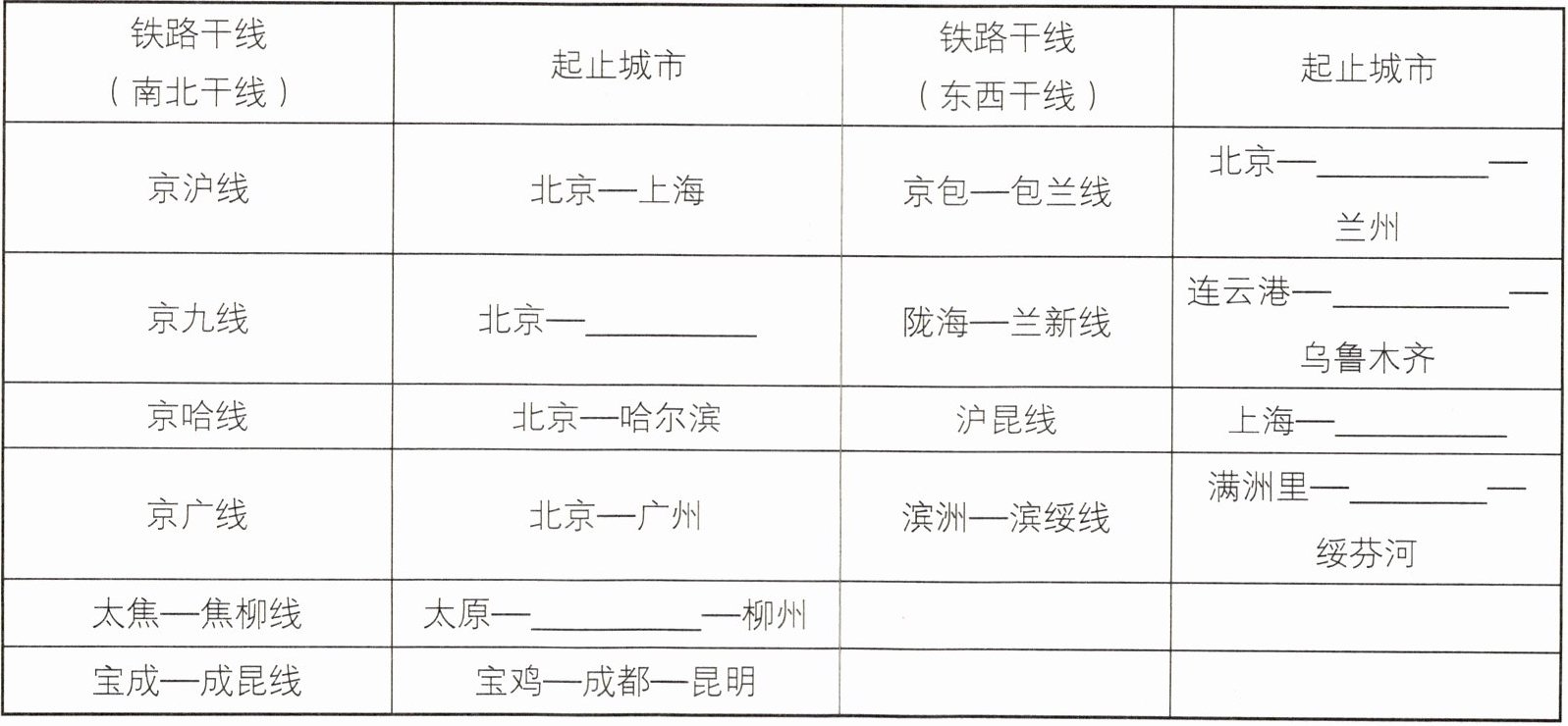 (在图中对应位置填写:京哈线、京沪线、京九线、京广线、太焦—焦柳线、宝成—成昆线、滨洲—滨绥线、京包—包兰线、陇海—兰新线、沪昆线;圈出:北京、上海、郑州、武汉、广州、西安、重庆、成都)
