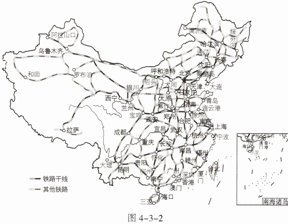 在图 4 - 3 - 2 中的相应位置填写下列铁路干线的名称:京哈线、京沪线、京九线、京广线、太焦—焦柳线、宝成—成昆线、滨洲—滨绥线、京包—包兰线、陇海—兰新线、沪昆线。并圈出下列铁路枢纽城市:北京、上海、郑州、武汉、广州、西安、重庆、成都。