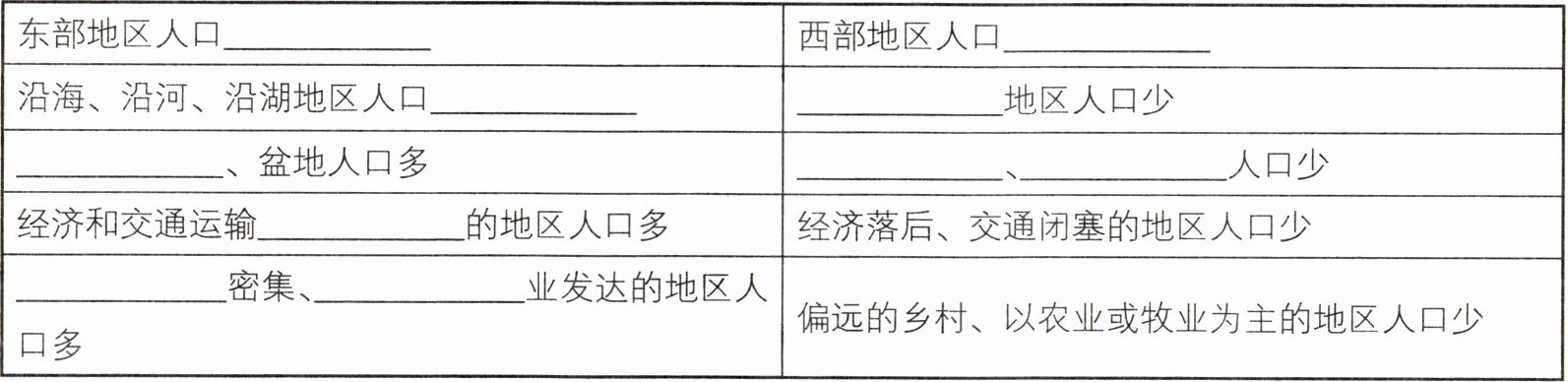 |____密集、____业发达的地区人口多|偏远的乡村、以农业或牧业为主的地区人口少|