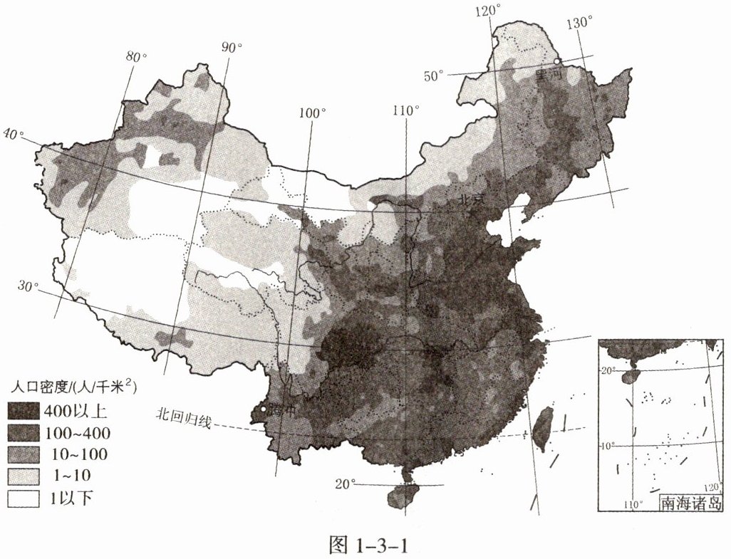 在图 1-3-1 上画出我国的人口分界线,并描画广东、山东、河南三个人口大省的省区轮廓。