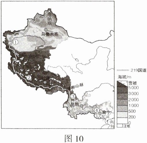 (1)219国道号称“世界级景观大道”,①②③④四段中能欣赏到“穿沙漠赏胡杨,塔克拉玛干风光美”的是______,能体验到“过雪山望冰川,青藏高原风光好”的是______,能感受到“行海滨观海浪,东南沿海风光美如画”的是______。(填序号)。