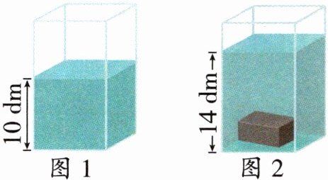 7 测量一块铁块的体积。实验小组的同学先将 50 L 水注人一个长方体水箱(如图 1),再将这块铁块放入长方体水箱中(如图 2),先后测量得到的数据如图所示。你能利用这些数据计算出铁块的体积吗?