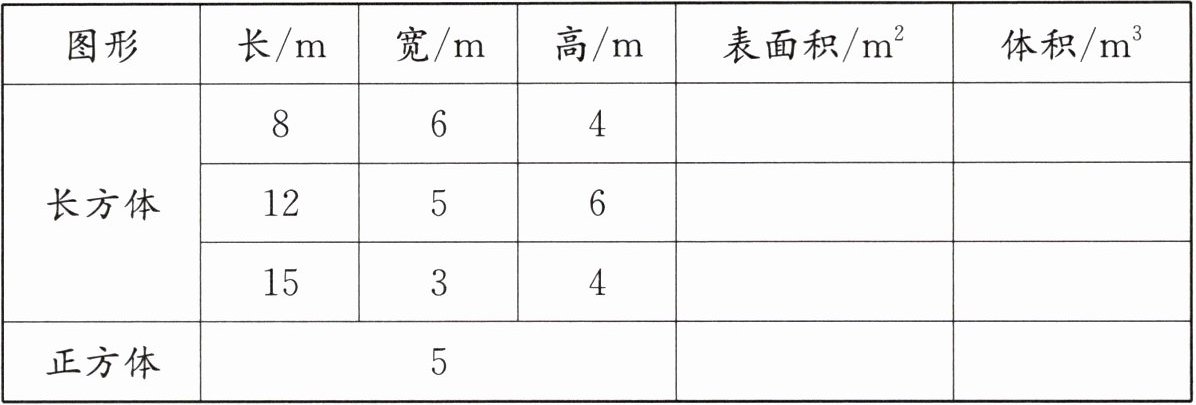 3.350 375【解析】拼成的长方体的长是15 cm,宽和高都是5 cm,长方体的表面积=2×(长×宽+长×高+宽×高)=2×(15×5+15×5+5×5)=350(cm²),长方体的体积=长×宽×高=15×5×5=375(cm³)。