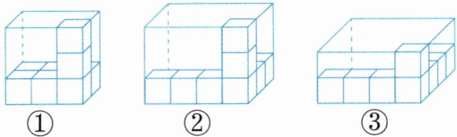 答:容积最大的盒子是②号,最小的是①号。【解析】要判断这些盒子哪个容积最大,就是看盒子里装满小立方体时,哪个盒子里的小立方体数量最多。①号盒子能装18个小立方体,②号盒子能装36个小立方体,③号盒子能装32个小立方体,能装的小立方体数量最多的是②号盒子,最少的是①号盒子,所以②号盒子容积最大,①号盒子容积最小。