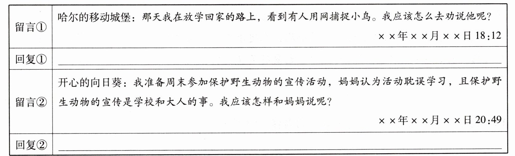 12. ①示例:你可以直接告诉他,这种做法是不对的,鸟是我们的朋友,我们不能伤害它们。捕鸟破坏了生态平衡,实际就是危害人类自身。同样都是生命,我们应该平等相待,不能因为一己私利而去伤害其他的生灵。②示例:你可以跟阿姨沟通,表示保护野生动物人人有责,不只是学校和大人的事。参加保护野生动物宣传活动,不仅能够奉献自己的爱心,还能锻炼口头表达能力以及适应社会的能力。