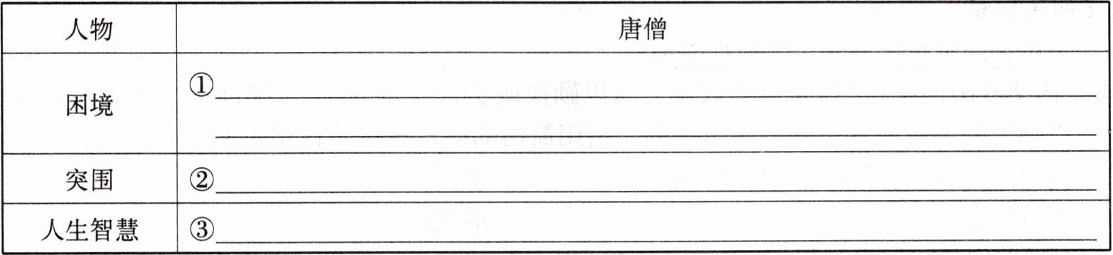 (2)班级开展以“经典名著中的人生智慧”为主题的读书分享活动。你所在的小组确定了“困境与突围”的专题。请你对《西游记》中唐僧这个人物进行梳理,完成下列表格。