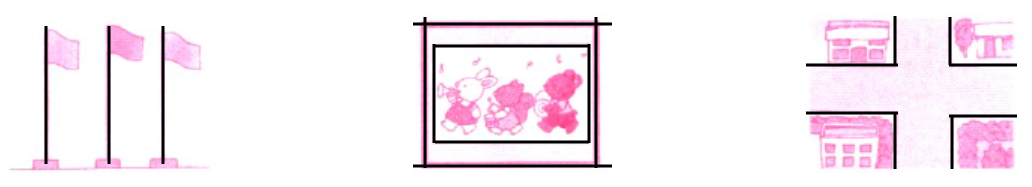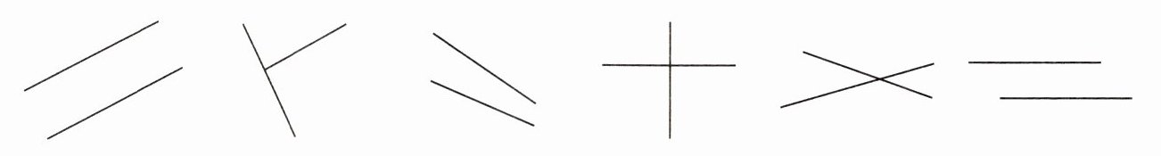 2. 互相平行的在下面画“√”,互相垂直的在下面画“○”,既不平行也不垂直的在下面画“×”。