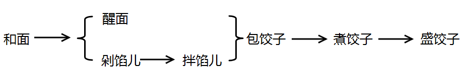 2. 包饺子要做的事情:剁馅儿15分钟,拌馅儿4分钟,和面6分钟,醒面5分钟,擀饺子皮、包饺子30分钟,煮饺子10分钟,盛饺子1分钟。怎样才能尽快吃上饺子?至少需要多长时间?