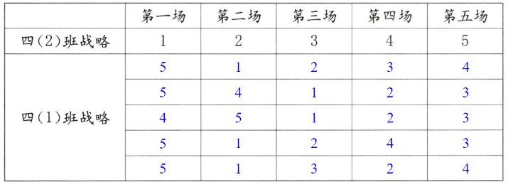 1. 四(1)班和四(2)班进行乒乓球比赛。每班选出打乒乓球最好的前五名同学(按五名同学的水平高低编号)参赛,共打5场球,5场3胜制。假如你是四(1)班的同学,你将怎样安排本班的五名选手比赛的出场顺序,才有可能打赢这次比赛?(两个班前五名对应名次水平相当。)