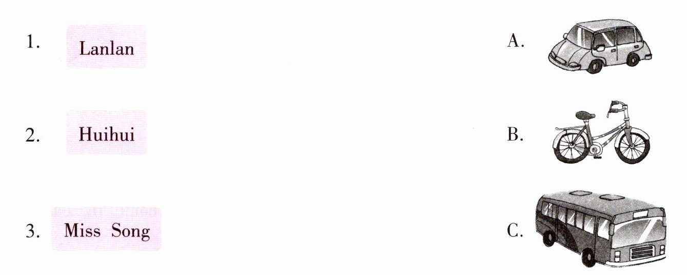 一、Listen and match. 老师和同学们通常是怎么来学校的呢?请听一听,将人物与相应的图片连线。