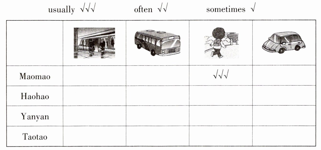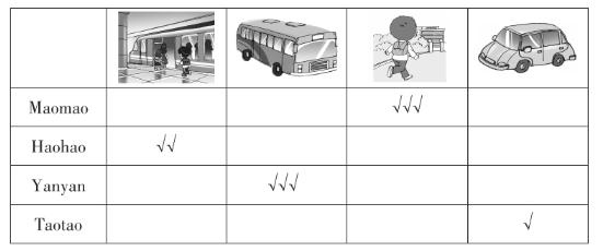 二、Listen and complete. Maomao做了关于同学们上学出行方式的调查表。请听一听,帮他完成调查表。