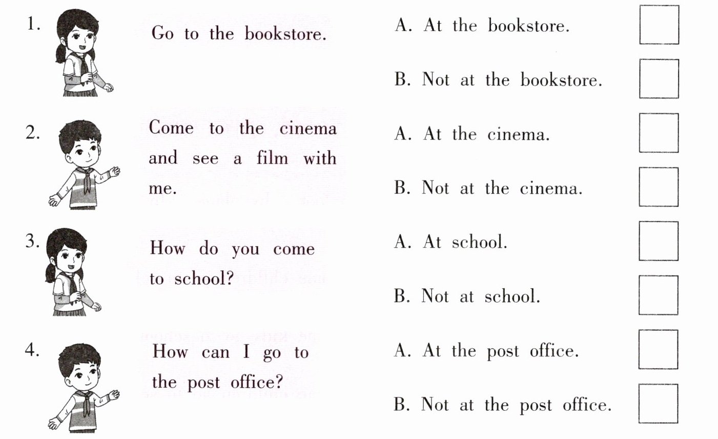 三、Read and tick. Lanlan和Jiejie在玩 “猜位置” 的游戏。请你根据他们说的话,在正确选项后面的方框内打 “√”。