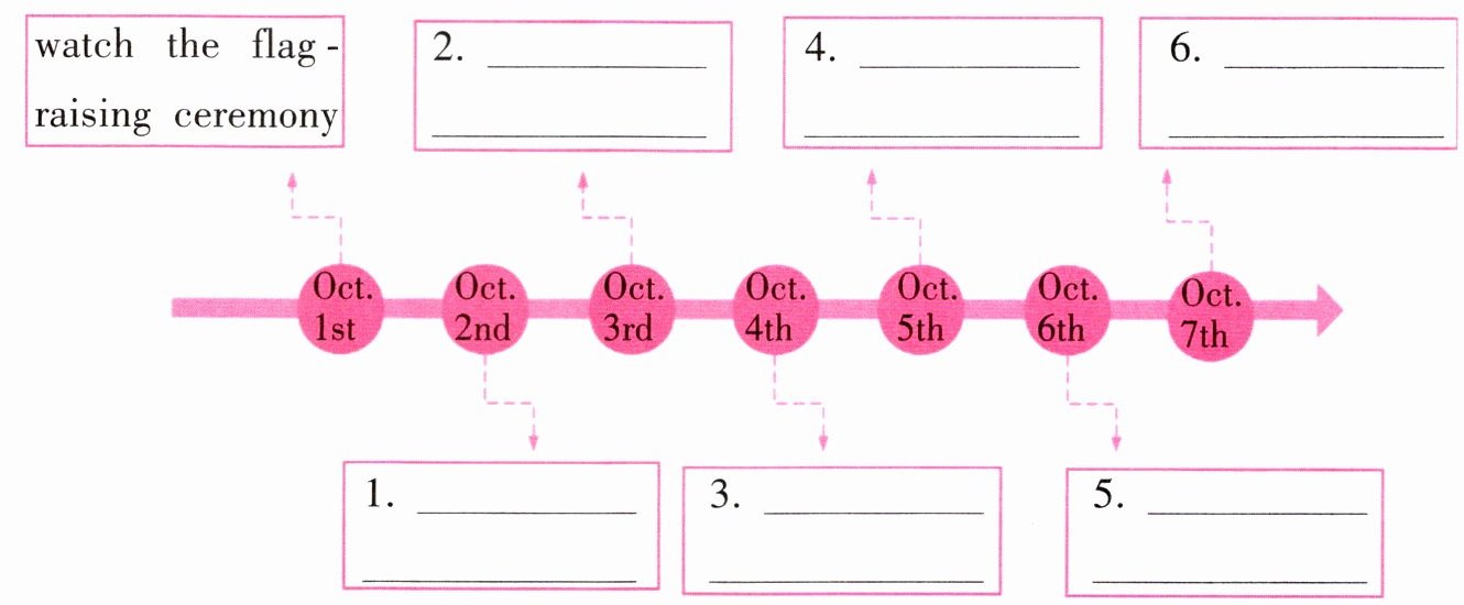 四、Read and finish. 国庆节就要到了,Peter制订了一份假期计划。请读一读,把他的假期计划流程图补充完整。