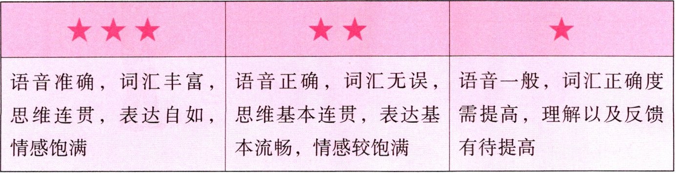 | 语音准确,词汇丰富,思维连贯,表达自如,情感饱满 | 语音正确,词汇无误,思维基本连贯,表达基本流畅,情感较饱满 | 语音一般,词汇正确度需提高,理解以及反馈有待提高 |
