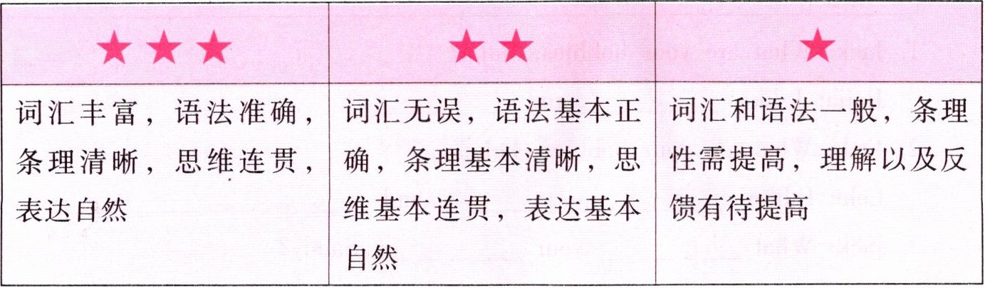 |词汇丰富,语法准确,条理清晰,思维连贯,表达自然|词汇无误,语法基本正确,条理基本清晰,思维基本连贯,表达基本自然|词汇和语法一般,条理性需提高,理解以及反馈有待提高|