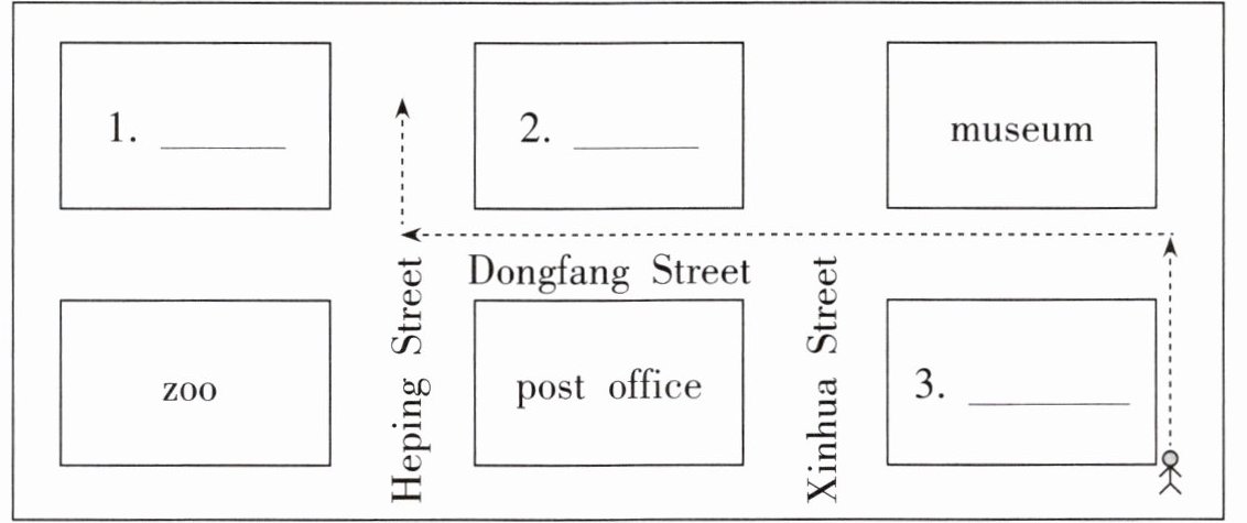 一、Listen and choose. Xinxin 想找一家餐厅吃饭,但她不知道具体路线,于是她向路人求助。请听一听,选择相应的场所,并将其序号填在横线上。