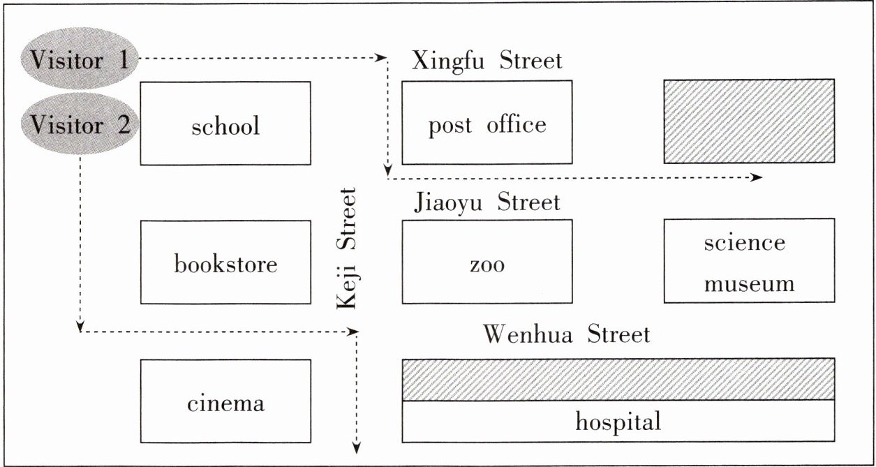 四、Read and choose. Lele 是一名城市志愿者,他正在为外地的游客们指路。请读一读,看图,选择正确的答案补全对话。