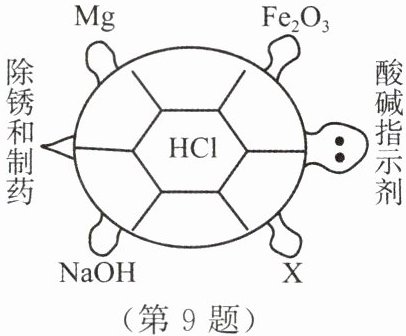 9. “盐酸化性乌龟壳,一头一尾四只脚。”如图所示为小王归纳的稀盐酸的化学性质,X所属的物质类别与图中其他物质不同,则X可能是(