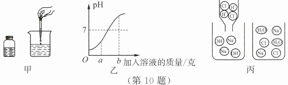 10. 某科学兴趣小组的三位同学在学习盐酸与氢氧化钠的反应后,分别结合自己在实验室中所做的实验,从不同方面用图像对其进行描述。图甲是实际操作图,图乙是反应过程中溶液的酸碱度变化曲线图,图丙是微观粒子结合过程的示意图。请回答下列问题: