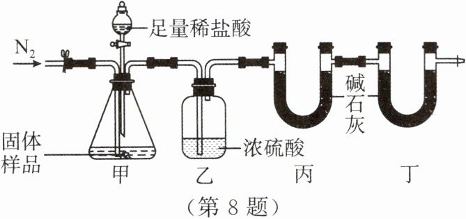8. $Ca(OH)_2$变质得到$Ca(OH)_2$和$CaCO_3$的混合物。小琳同学设计了如图所示的实验装置来测定$CaCO_3$的含量,她用气密性良好的装置装上药品并通一会儿氮气后关闭止水夹,再打开分液漏斗活塞。提示:碱石灰(可以吸收$CO_2$和$H_2O$)、浓硫酸均足量,不考虑稀盐酸的挥发性。