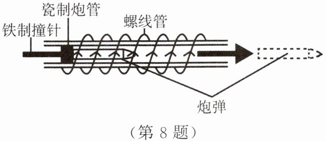 8. 1901年,挪威人伯克兰制造出世界上第一台电磁发射器,开创了电磁炮的先河。为了认识电磁炮的一些特性,小柯制作了一个电磁炮模型,其原理如图所示。螺线管通电后,铁制撞针迅速前移,推动炮弹射出炮管。