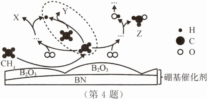 $4. $有学者揭示了硼基催化剂催化甲烷与氧气反应生成$ X、$$Y $和$ Z $等产物的过程,下图为其局部过程的微观示意图$($图中$“…”$表示省略相关过程$)。$